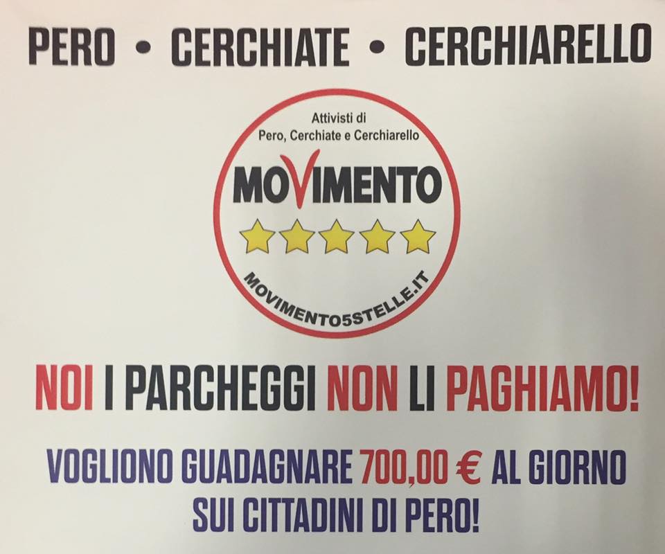 Il Movimento 5 Stelle Pero si è attivato contro l'attuale giunta comunale raccogliendo firme e opinioni dalla gente che vive Pero ogni giorno. Abbiamo raccolto e protocollatole firme dei cittadini contrari al parcheggio a pagamento per tutti, compreso i residenti. Ci siamo attivati e abbiamo organizzato una serata evento dove tecnici e non del movimento hanno spiegato le ragioni di questo incredibile ricatto nei confronti di tutti noi Peresi. il movimento ha incontrato il Sindaco per spiegare le ragioni dei cittadini, ma seppur accogliendo e ringraziando il movimento per aver presentato l'unica alternativa progettuale, il sindaco e tutta la sua giunta hanno continuato imperterriti con le loro idee.